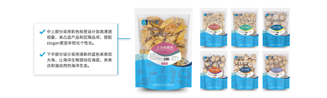 包裝的外觀設(shè)計(jì)主體為藍(lán)色海底色,搭配矢量寫實(shí)海洋生物,如同包裝內(nèi)的新鮮海鮮食材 ,傳達(dá)著自然、美味、安心的產(chǎn)品特色與信息。中上部的Slogan 凸顯出 專屬 個(gè)性化的體驗(yàn)理念。從中央往外延伸出的雙拼色帶,則以青春,悅動的色彩表現(xiàn),作為各產(chǎn)品系列品項(xiàng)之間的區(qū)隔。